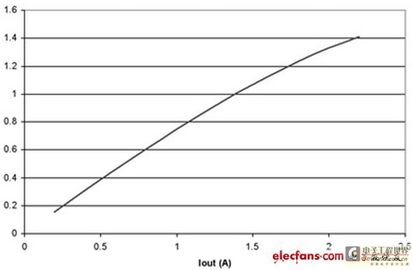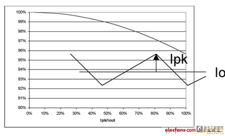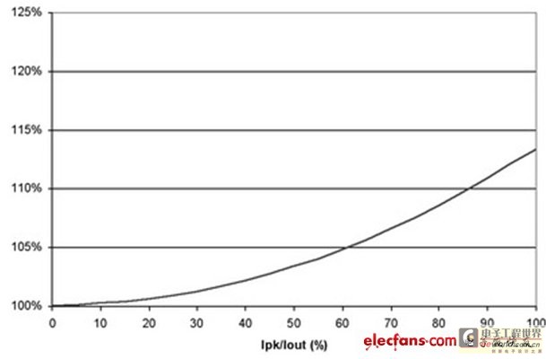图4 也阐明了即使在纹波电流较大的时候,对功耗也没有重大影响。例如,50%的纹波电流仅增加不足5%的功率损耗。当大大超过此水平时,需要减小电源的DC电流以保持结温不变,从而维持半导体的使用寿命。经验法则显示,结温每降低10%,半导体使用寿命就会延长两倍。并且,许多设计都倾向于更小的纹波电流,这是因为电感器的限制。绝大多数电感的设计处理能力小于20%的Ipk/Iout纹波电流比率。典型应用
